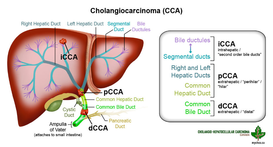 - There are three different types of cholangiocarcinoma (CCA), based on location: